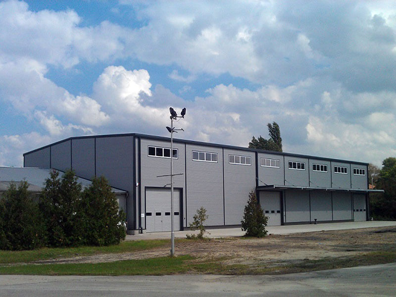 A csarnok mérete a telek beépítési lehetőségeit, és a meghatározott védőtávolságokat figyelembevételével lett kialakítva. Az épület bruttó alapterülete 1047,21 m2. A csarnok keleti és nyugati végében egy-egy zárt áruátvevő (138,05 m2 illetve 376,30 m2) található, ezek fogják közre magát a raktár csarnokot. A tetőszerkezet, megfelelő tűzállósági tanúsítvánnyal rendelkező, hőszigetelt panelrendszerből készült. Az épület déli oldalán, egy acél szerkezetű előtető fut. A meglévő épület végfalába a tűzvédelmi előírásoknak megfelelő tűzgátló ajtókat építettünk be. A logisztikai csarnokból nagy magasságú, acélszerkezet erősítésű gipszkarton válaszfalak választják le az áruátvevő helyiségeket. Az áruforgalom lebonyolításához a csarnok előtt megfelelő teherbírású térburkolat kialakítására volt szükség. A csarnok belső burkolata acélhajas ipari padlóburkolatból készült.